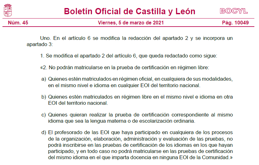 * ¿QUÉ REQUISITOS DEBO CUMPLIR? * Para la matrícula de las pruebas de certificación en régimen libre, no será necesario estar en posesión de un certificado de un nivel inferior para acceder a la prueba de certificación de nivel superior. Será requisito indispensable tener 16 años cumplidos en el año de realización de la prueba. Asimismo podrán acceder quienes tengan 14 años, cumplidos en el año natural en que comiencen los estudios, para realizar la prueba de certificación de un idioma distinto del cursado en Educación Secundaria Obligatoria como primera lengua extranjera. No podrán matricularse en la prueba de certificación en régimen libre: La formalización de la solicitud implicará la autorización por el solicitante a la grabación en soporte digital de audio de las pruebas correspondientes a las actividades de lengua de Producción y Coproducción de textos orales y de Mediación oral.